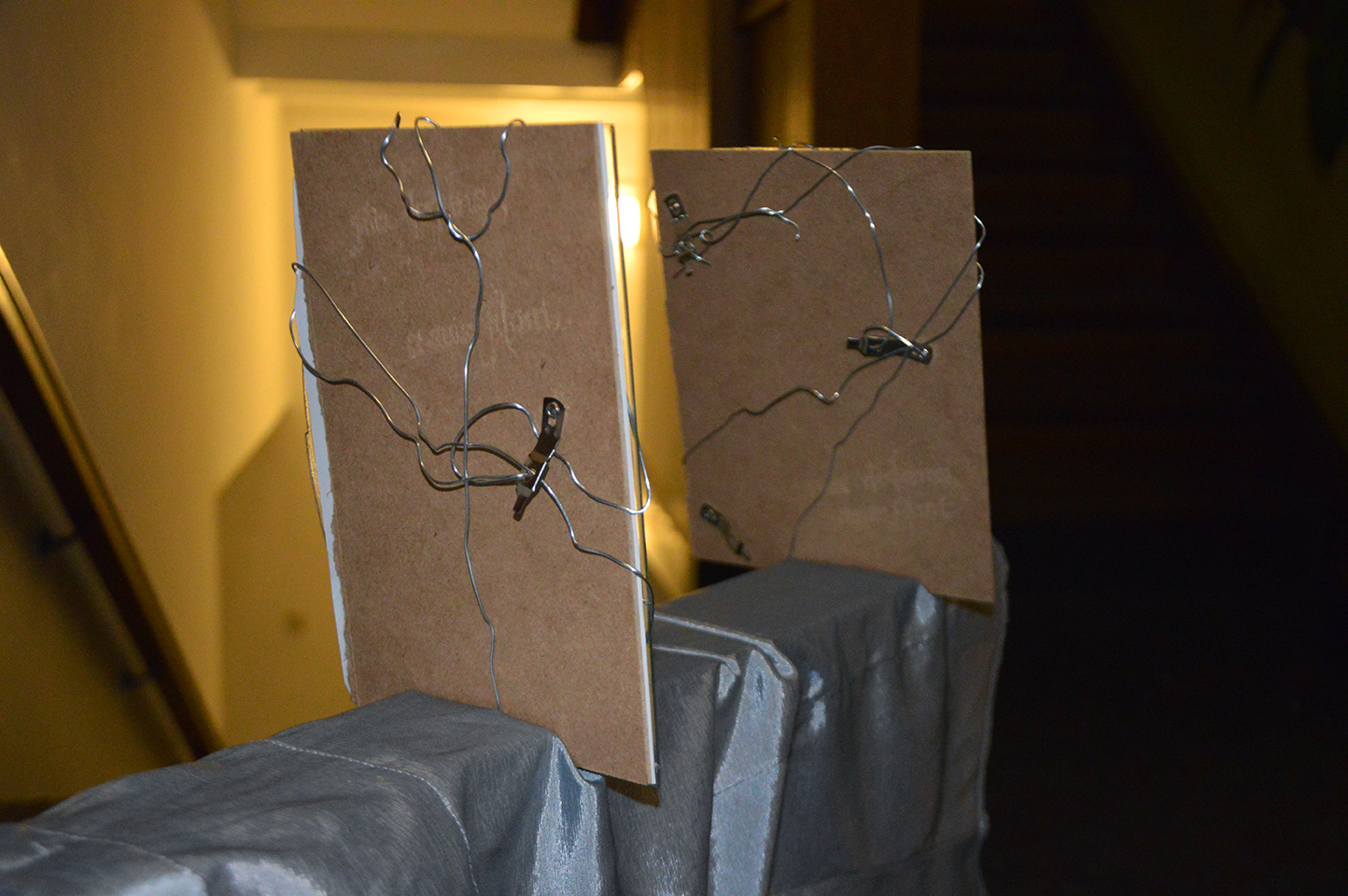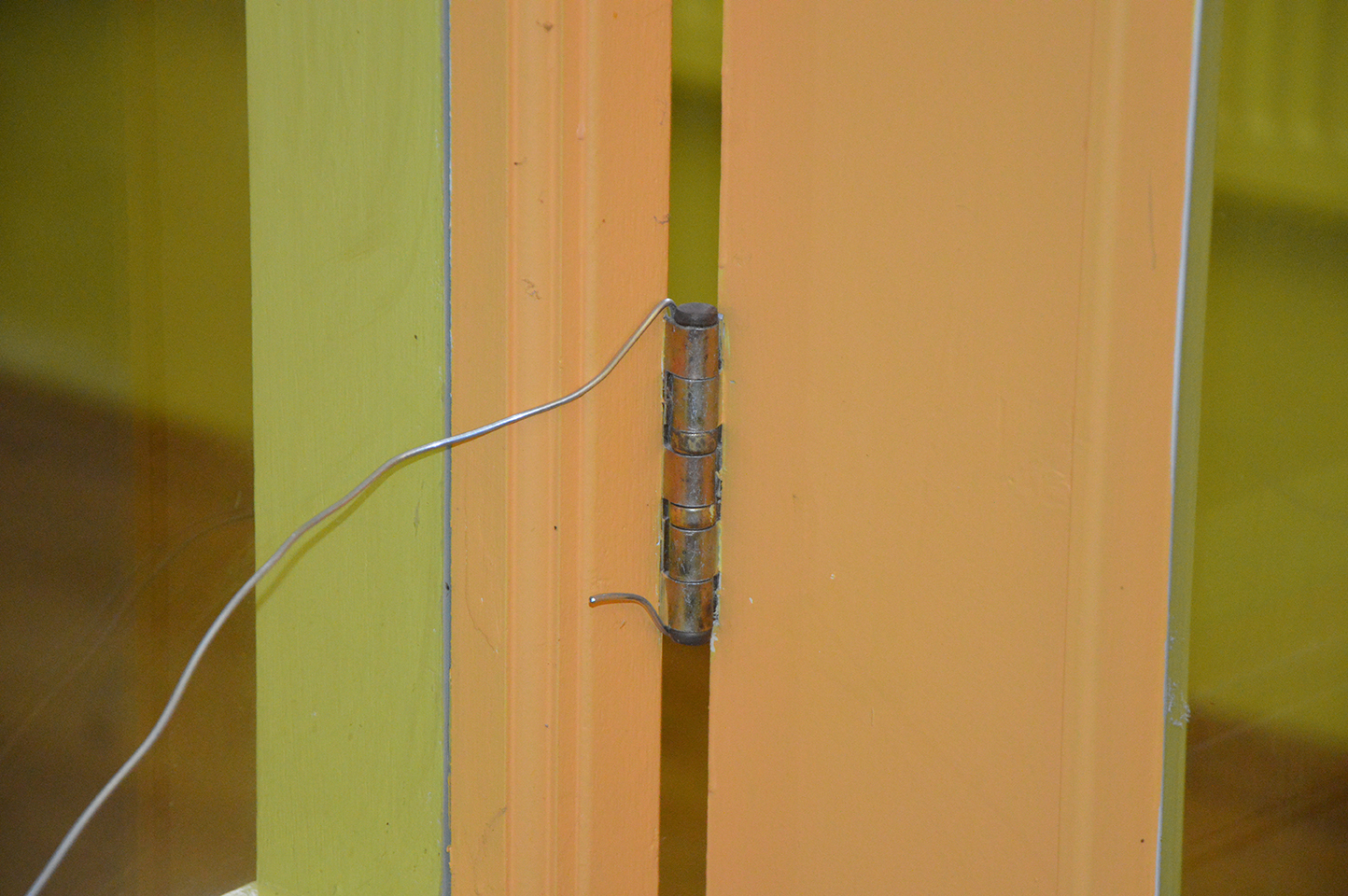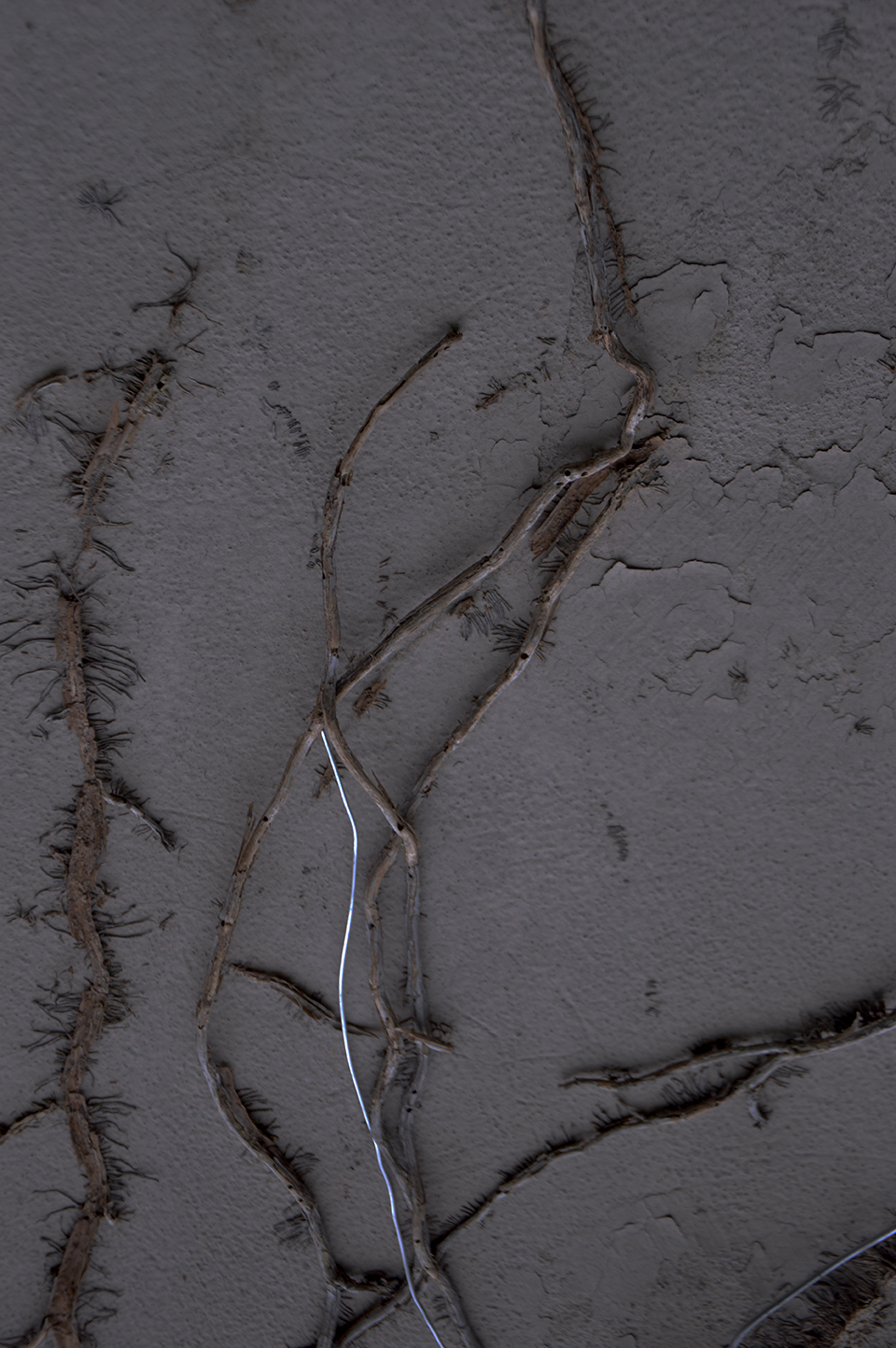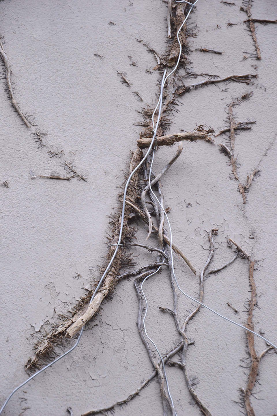 and fuis dedans, suis filant. Sculptures of wire on walls, in doors, outdoors frames of windows, indoors frames of photos.