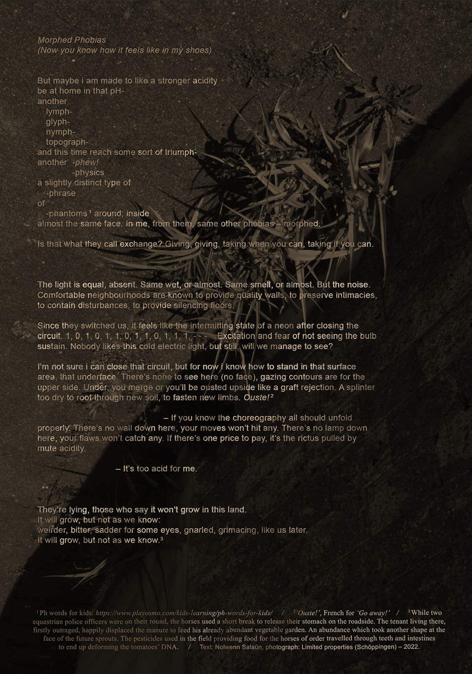 (2022) Text and poster for Hosting Soil, a project by Franziska Goralski, Kitty Maria & Élise Ehry. Their action consisted of inverting 1m3 of land between the surfaces of the 2 most and least expensive neighborhoods on the market in Amsterdam (figures from 2021). Curated by Jules van den Langenberg; supported by Gemente Amsterdam, Theo van Doesburg Foundation and Common’s Network.