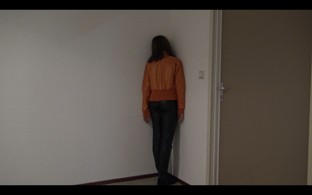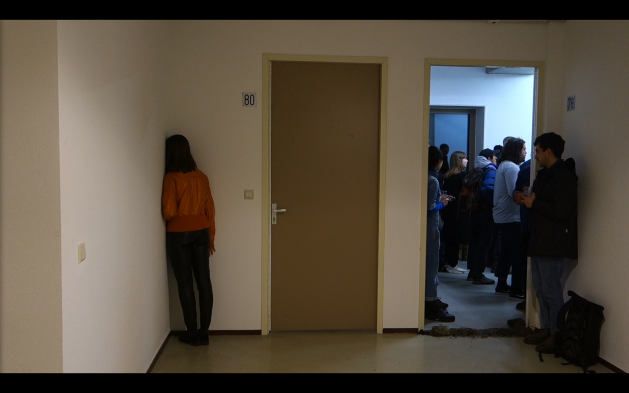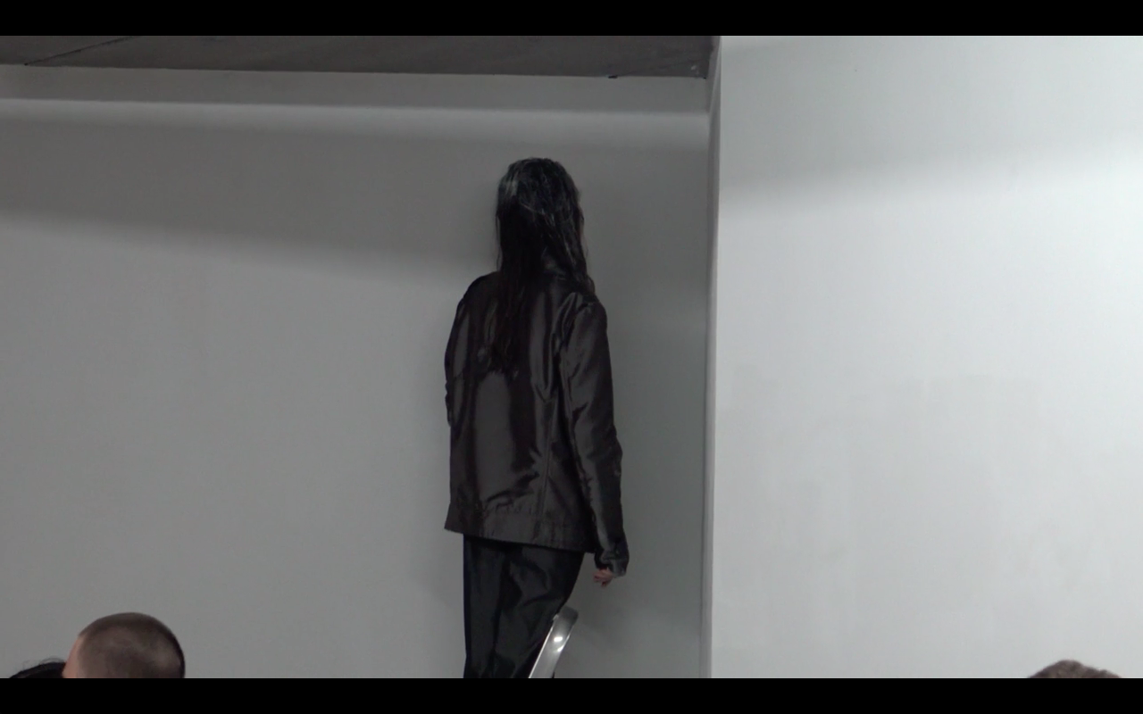 Performance with Sophia Dinkel & Mong-Hsuan Tsai. 2 figures communicate through the wall they are both stuck on, or are they entering this wall? A third one seems to respond from the other side. https://vimeo.com/330121339